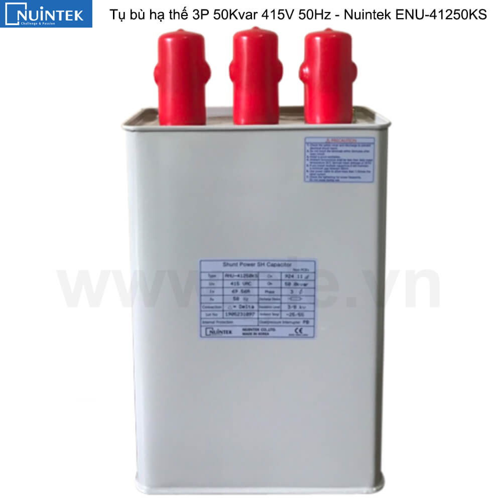 Capacitor Nuintek KNE-4438226S : ប្រភេទស្ងួត 3P 50Kvar 440V 50HzCapacitor Nuintek ANU-41225KS : កុងដុងជ្រុង 3P 25Kvar 415V 50Hz